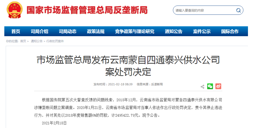 根据国务院第五次大督查反馈的问题线索,2018年12月,云南省市场监管局对蒙自四通泰兴供水有限公司涉嫌垄断问题立案调查。2020年1月21日,云南省市场监管局对当事人依法作出行政处罚决定,责令其停止违法行为,并对其处以2018年度销售额6%的罚款,计2495422.79元。