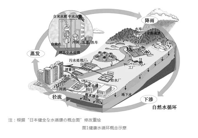 2014年至今,日本城市水系统进入了体系优化阶段,这一阶段最显著的特点是健康水循环理念得到前所未有的重视,城市水系统工作从要素治理向系统综合整治转变。事实上,日本很早就开始重视水循环的重要作用,2000年制定的《全国综合水资源计划》(又称“21世纪水计划”)就提出了构筑可持续的用水体系,适应循环型社会发展的要求,但由于种种原因,这一理念在涉水工作发展进程中并未被完全落实。随着日本经济社会发展模式的转变,人口老龄化和气候变暖等多种因素的影响,加以城市水资源、水环境、水安全问题仍旧凸显,日本的城市规划建设者开始意识到城市水系统是城市复杂大系统的重要组成部分,涉及城市水资源开发利用、水环境治理保护、水安全保障提升等全要素全过程,局部的涉水工作难以解决整体问题,需要用系统的思维来认识和分析面临的水问题,以城市为核心构建健康水循环才能实现城市水系统对经济社会的永续支撑(见图1)。