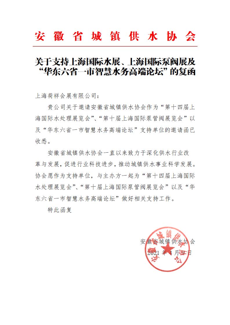 为帮助安徽省水务企业进一步开拓市场,促进国内外企业之间的经贸合作与技术交流,安徽省城镇供水协会决定将全力支持 2021 年 6 月 2 日在上海国家会展中心(虹桥)举办的2021华东六省一市智慧水务高端论坛,与主办方上海k1体育会展有限公司携手为城镇水务行业搭建一个国际性商贸交流平台,助力企业更好的抓住行业机遇,积极促进我国城镇水务行业在"十四五"期间获得快速发展。