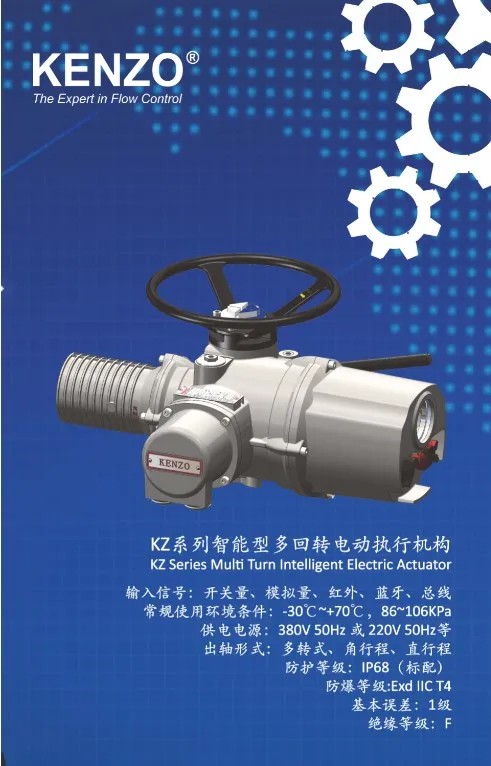 肯佐控制设备(上海)有限公司生产的新一代智能型kz系列电动执行机构,可以通过一个独立的设定器对其进行非侵入性的快速设定、检查及查询。执行机构采用大屏液晶显示器,以中文、数字、图形等形式显示执行机构的转矩、阀门位置、限位设定等工作状态和报警,极大地方便了用户的操作使用。