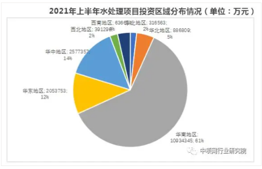 2021年上半年,华南地区水处理项目投资额为1093亿元,占全国水处理行业项目投资额的61%,其次是华中地区258亿元占比14%,华东地区205亿元占比12%。
