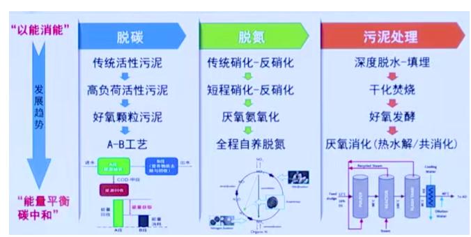 围绕工艺的转变,污水处理技术要从“以能消能”到能量平衡、“碳中和”转变。其中,脱碳体系要重点关注a-b法和整体营养物回收,这是主流工艺的未来;脱氮方面,主要聚焦自养脱氮技术;此外,污泥处理,从传统的脱水-填埋到碳化、能源化转变,在碳中和形势下会有巨大潜力。