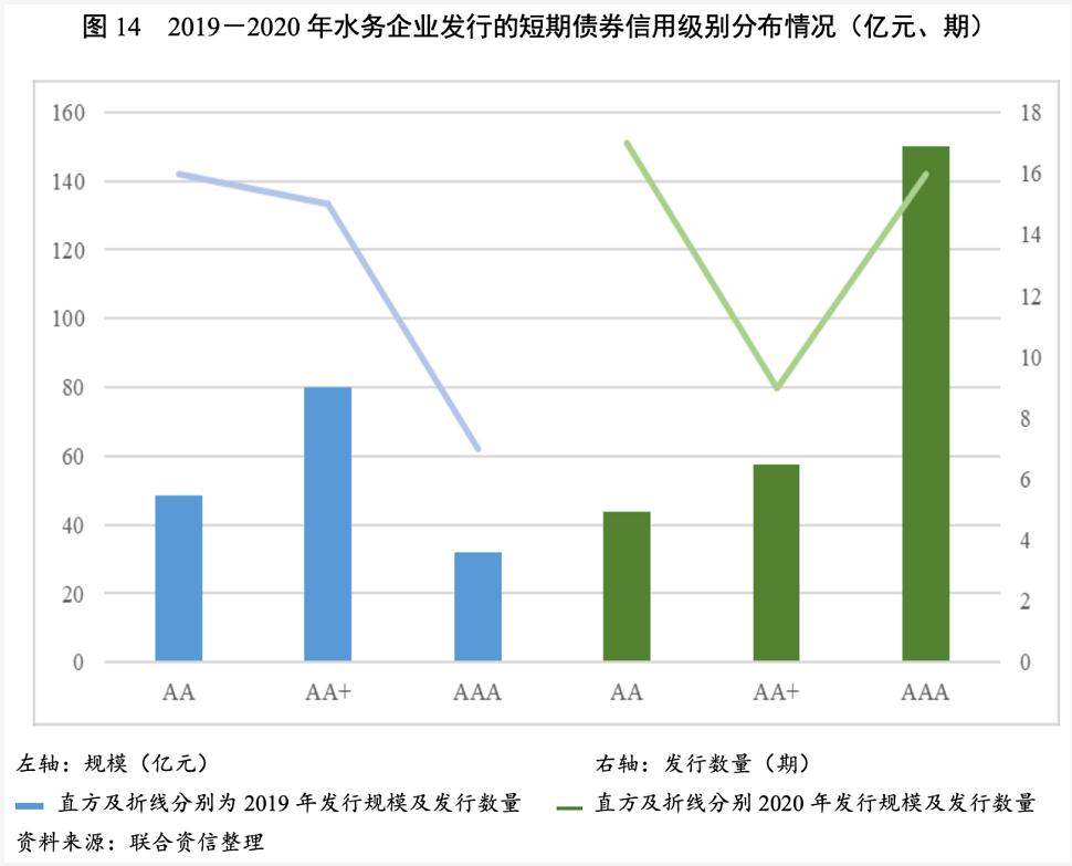 2020年,水务企业短期债券发行期数及规模继续上升,各级别发行主体中,aa级主体发债期数仍然最多,发行规模延续了向高级别集中的趋势。