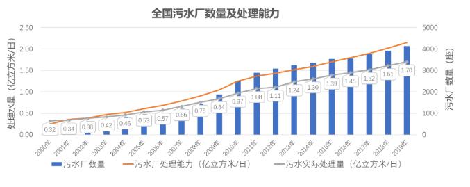 污水处理量:截至2019年底,全国城市和县城污水处理厂共4140座,污水实际处理总量达到1.7亿m3/d,污泥产量约6000万吨/年(80%含水率)。