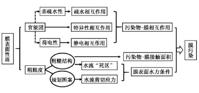 膜表面的亲疏水性、荷电性和官能团种类决定了膜与特定污染物之间的疏水作用、静电作用和特异性相互作用,而表面粗糙度则影响污染物与膜的接触面积或位点,以及错流过滤时膜表面的水力条件。决定膜表面粗糙度的形貌特征可分为粗糙结构和规则图案两类。