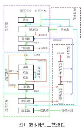 根据酚氰废水的水质特征,确定采用重力除油+加压溶气气浮+sdn(a/oo+二沉池)+混凝沉淀的核心工艺对其进行处理,工艺流程如图 1所示。