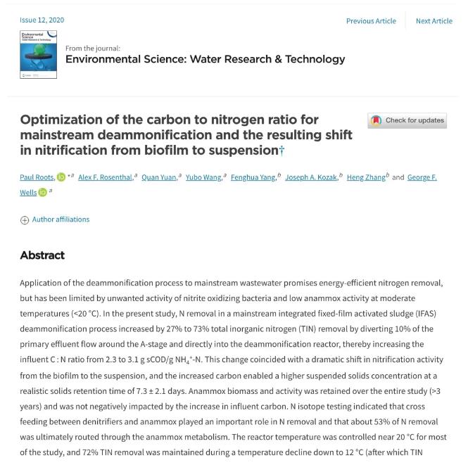 目前他们已经有一些发表的论文成果,例如下边这篇文章,他们发现改良碳氮比的过程还伴随硝化反应从生物膜转移到悬浮液相中。这一个个的小发现都会帮助研究人员加深对pdn/a工艺关键控制和潜在机制的理解。