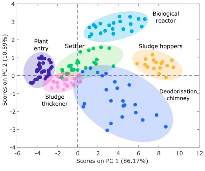 通过pca主成分分析,污水厂可以更直观地了解不同地点的臭气源类型: