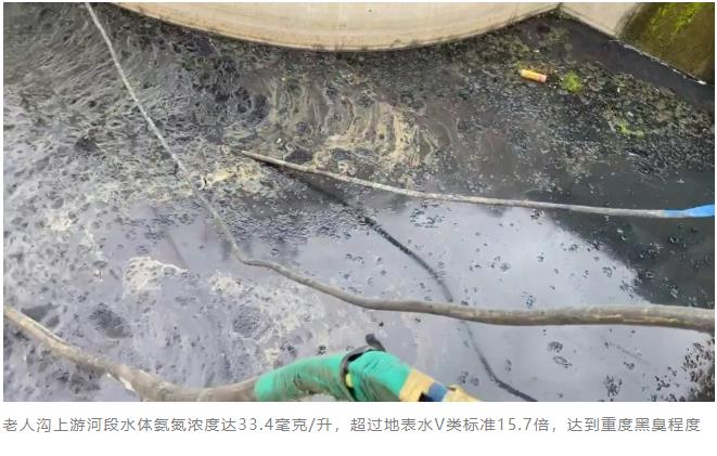 督察组前期暗访发现,老人沟沿江平路2公里长的河段水体明显发黑发臭,氨氮浓度最高为33.4毫克/升,超过地表水v类标准的15.7倍,达到重度黑臭程度。进一步排查发现,河道沿线排污纳管仍不彻底,存在7个生活污水直排口。其中,距入槐泗河口约200米处的一处污水井大量溢流,采样监测结果显示,外排污水化学需氧量、氨氮浓度分别高达136毫克/升、46.0毫克/升;江阳家园西侧排口排水氨氮浓度达到34.0毫克/升。老人沟上游段新建的提升泵站污水溢流入河,外排污水化学需氧量、氨氮浓度分别达到82毫克/升、19.4毫克/升。