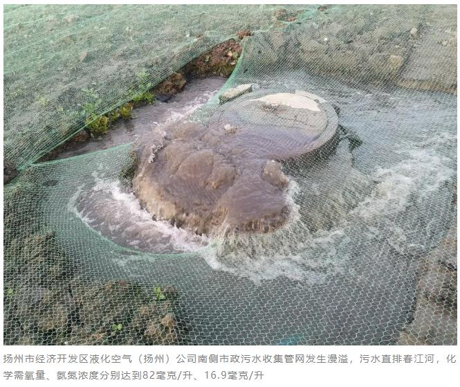 督察发现,部分区域管网破损、污水溢流问题多发。12月10日,督察组在扬州市经济开发区春江路液化空气(扬州)公司南侧发现两处污水管网漫溢口,大量污水排入春江河,在河面形成明显的污染带。当地专门开挖沟渠用于污水导流,表明该问题已存在较长时间。