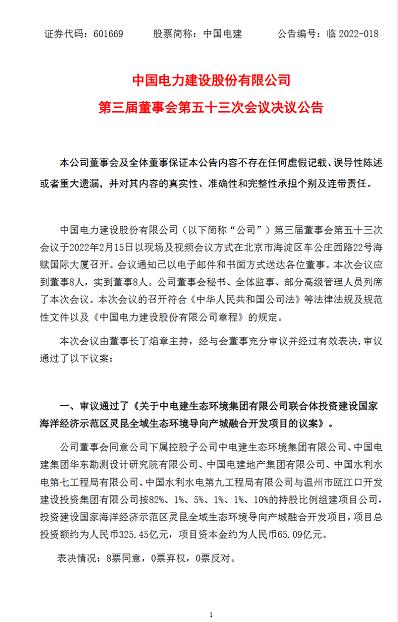 近日,中国电建发布公告称,公司审议通过了《关于中电建生态环境集团有限公司联合体投资建设国家海洋经济示范区灵昆全域生态环境导向产城融合开发项目的议案》。