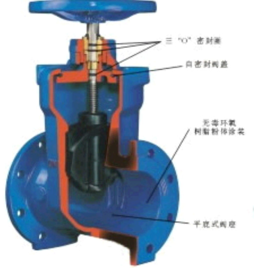 转动手轮,通过手轮与阀杆的螺纹的进、退,提升或下降与阀杆连接的阀板,达到开启和关闭的作用。